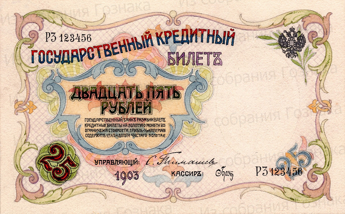 ![]() Эскизный проект лицевой стороны государственного кредитного билета достоинством 25 рублей. Художник Р. Г. Заррин. 1903 год. |