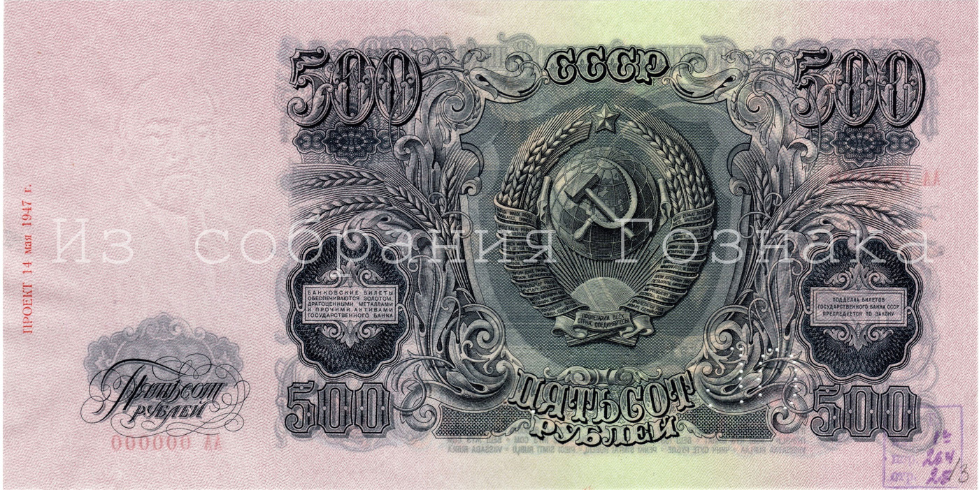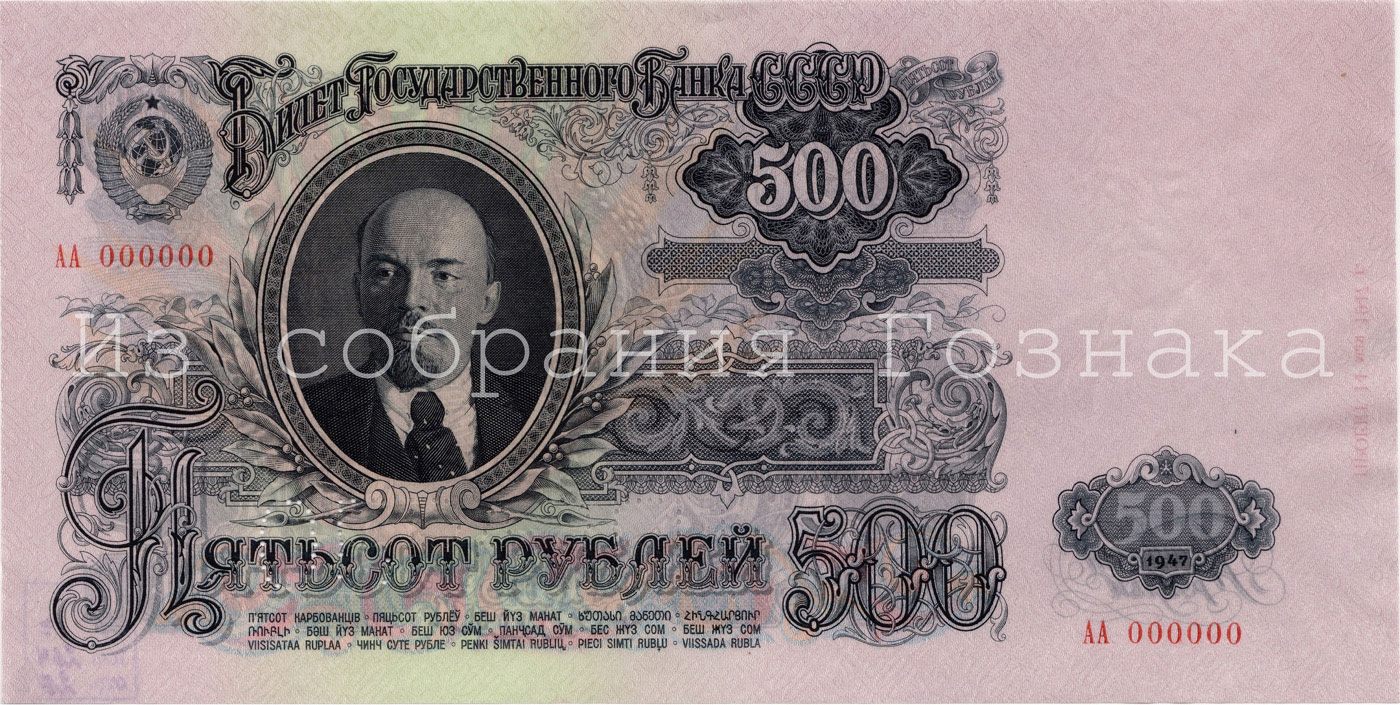 В 1947 году в СССР прошла денежная реформа, и в обращение были выпущены новые банкноты. Самая крупная банкнота имела номинал 100 рублей. Однако специалисты Гознака готовили также 250- и 500-рублевые банкноты. Дело дошло до изготовления печатных проектов, но они не были утверждены к выпуску.
