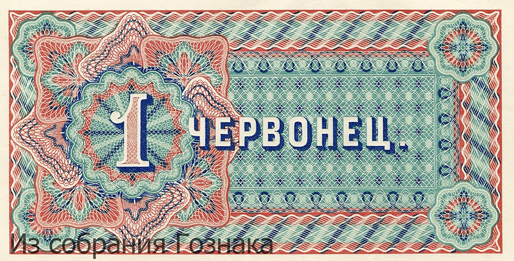 Пробный оттиск билета Государственного банка СССР достоинством 1 червонец, выполненный по эскизу И. И. Орлова с применением усовершенствованной орловской печати с нюансировкой. Около 1927 года.