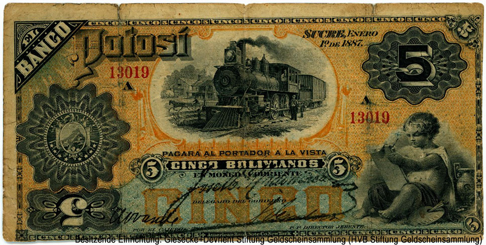 Banco Potosi. Эмиссии коммерческих банков Боливии. 5 боливиано — Enero 1? de 1887. Serie A номер красный