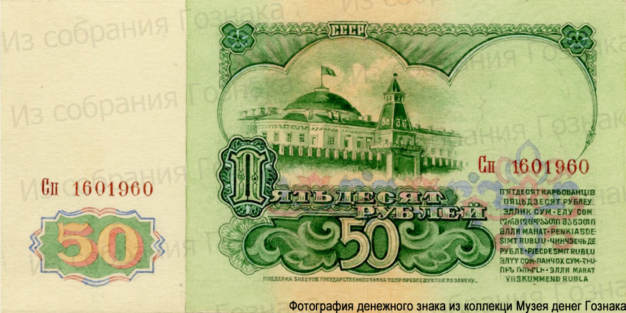 Эскизный проект оборотной стороны билета Государственного банка СССР номиналом 50 рублей. Художник С. А. Поманский. 1960 год.