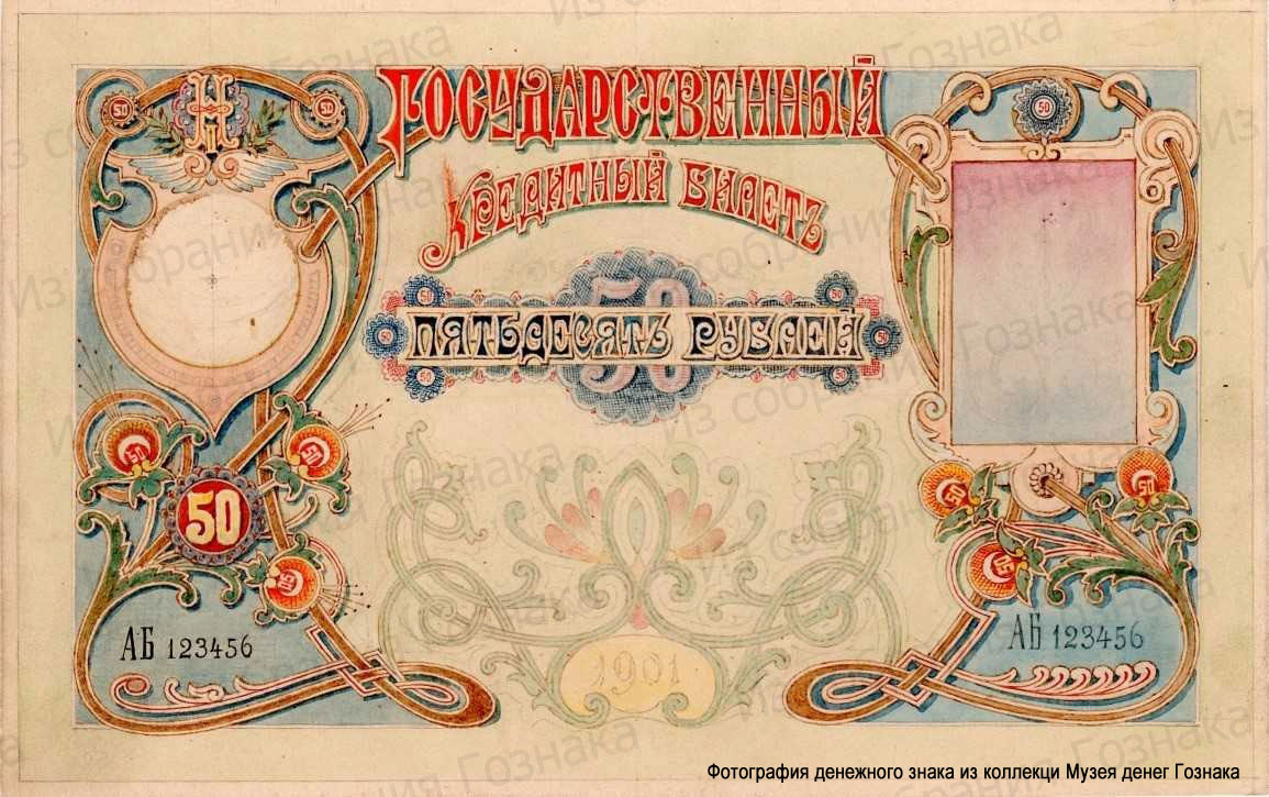 Эскизный проект лицевой стороны государственного кредитного билета достоинством 50 рублей. Художник А. Ф. Бальдингер. Около 1900 года.