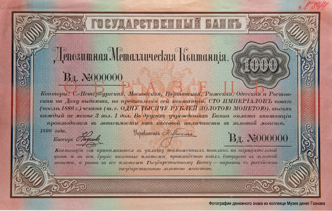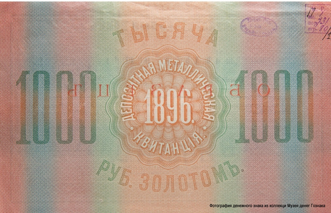 Российская Империя. Государственный Банк. Депозитная Металлическая Квитанция 1000 рублей золотом образца 1896 года (Тип 1).