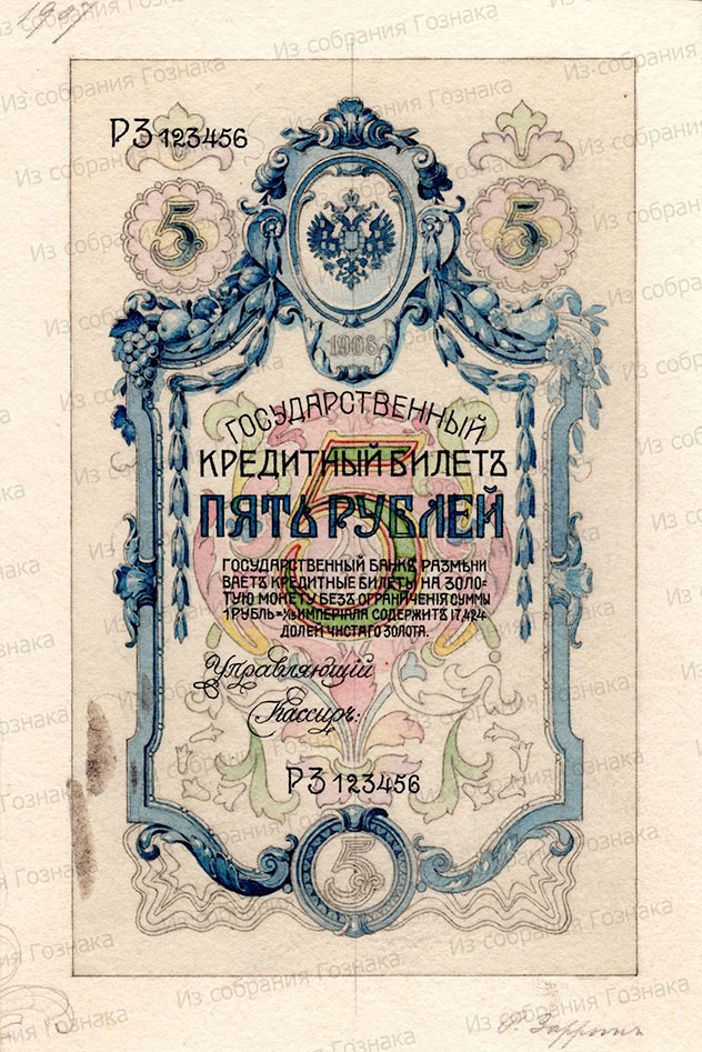 Эскизный проект лицевой стороны государственного кредитного билета номиналом 5 рублей. Художник Р. Г. Заррин. 1907 год.