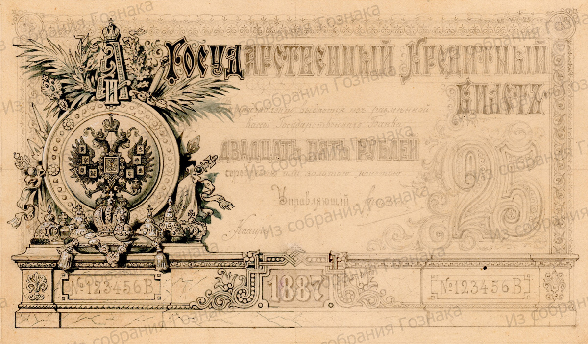 Эскизный проект лицевой стороны государственного кредитного билета номиналом 25 рублей. Художник А. Ф. Бальдингер. Около 1887 года.