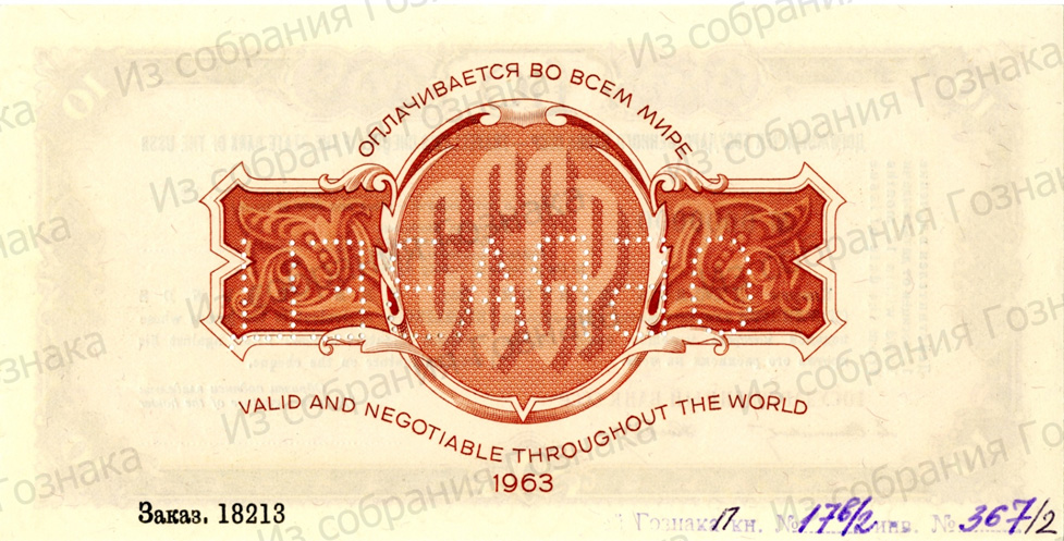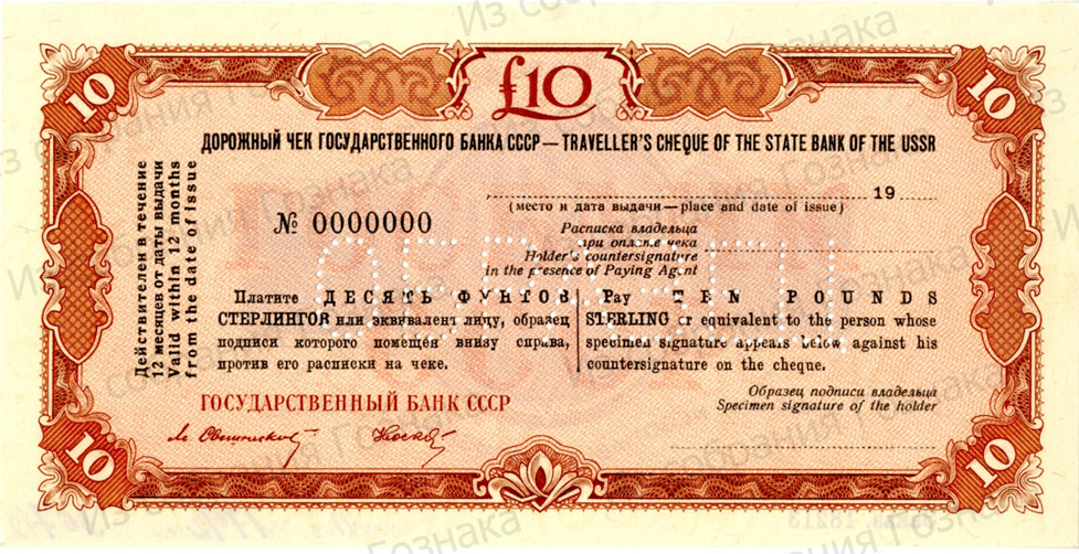 Дорожный чек Государственного банка СССР на сумму 10 фунтов стерлингов. Образец. 1963 год.