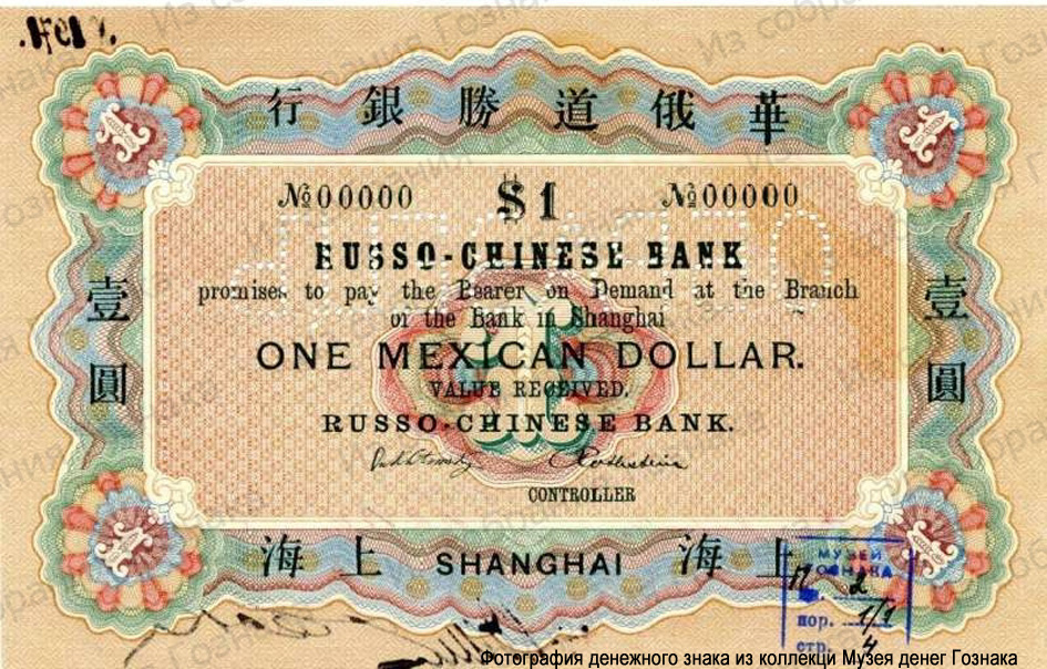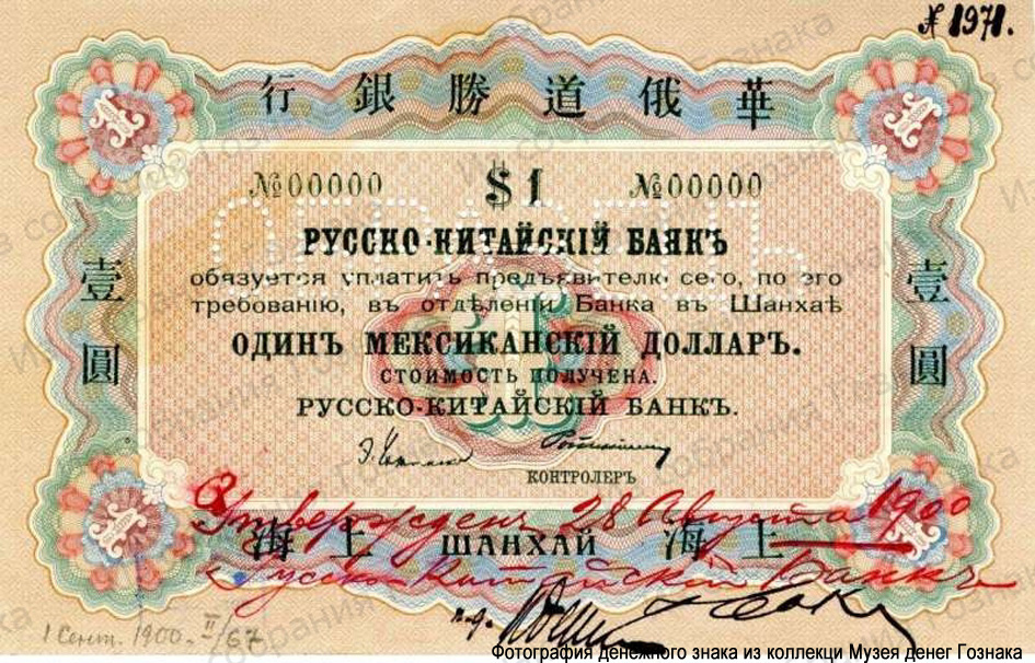 Утвержденный печатный проект банкноты Русско-Китайского банка номиналом 1 мексиканский доллар. 1900 год.