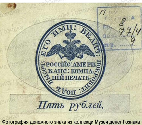 Платежная марка Российско-Американской компании номиналом 5 рублей. Образец. 1858 год (?)